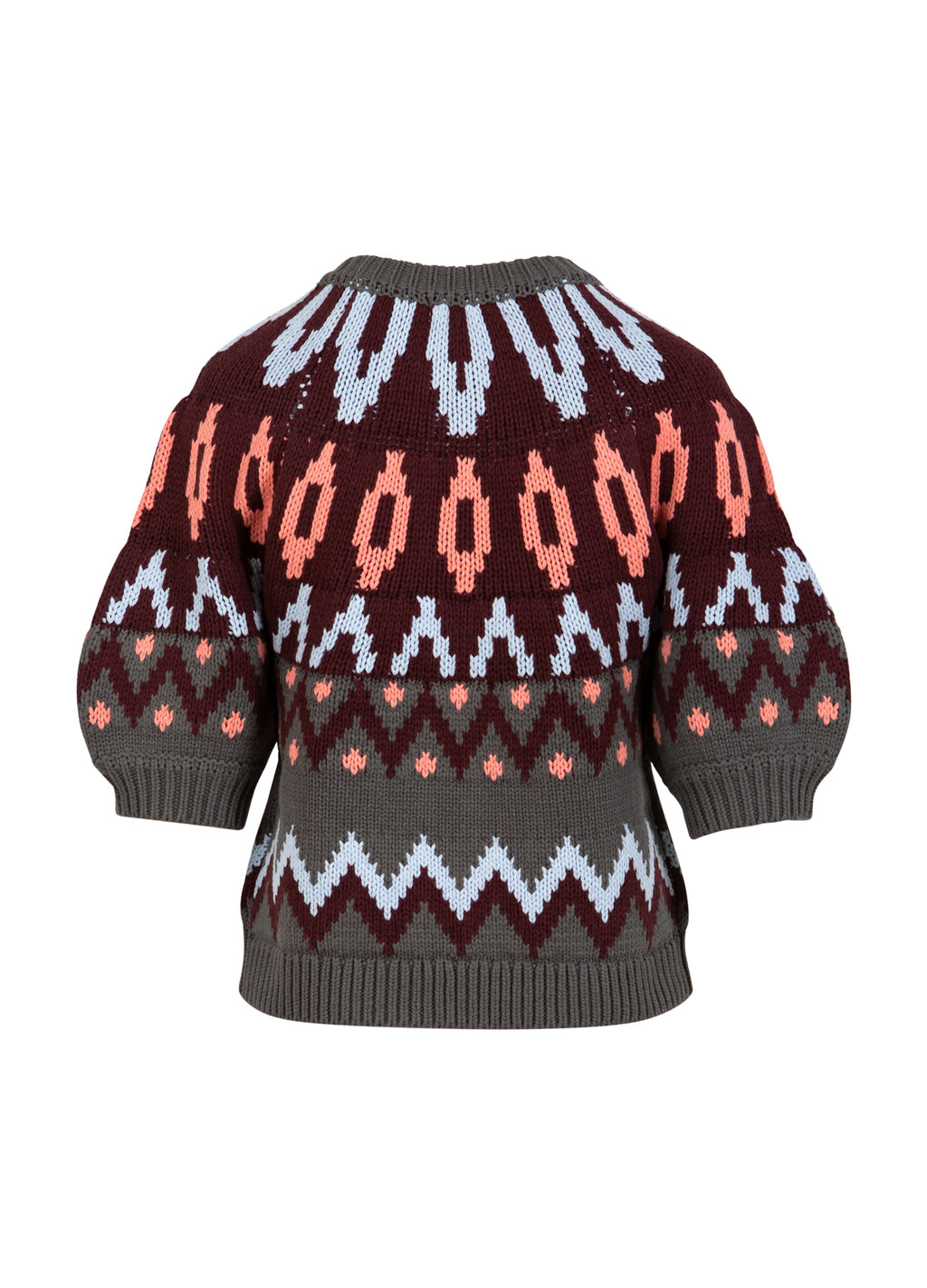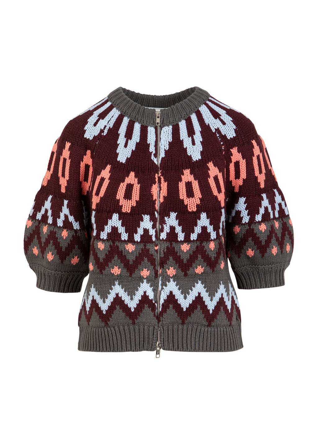 Het model is 182 cm lang en draagt maat S. Haar buste meet 82 cm, taille 61 cm en heupen 93 cm.