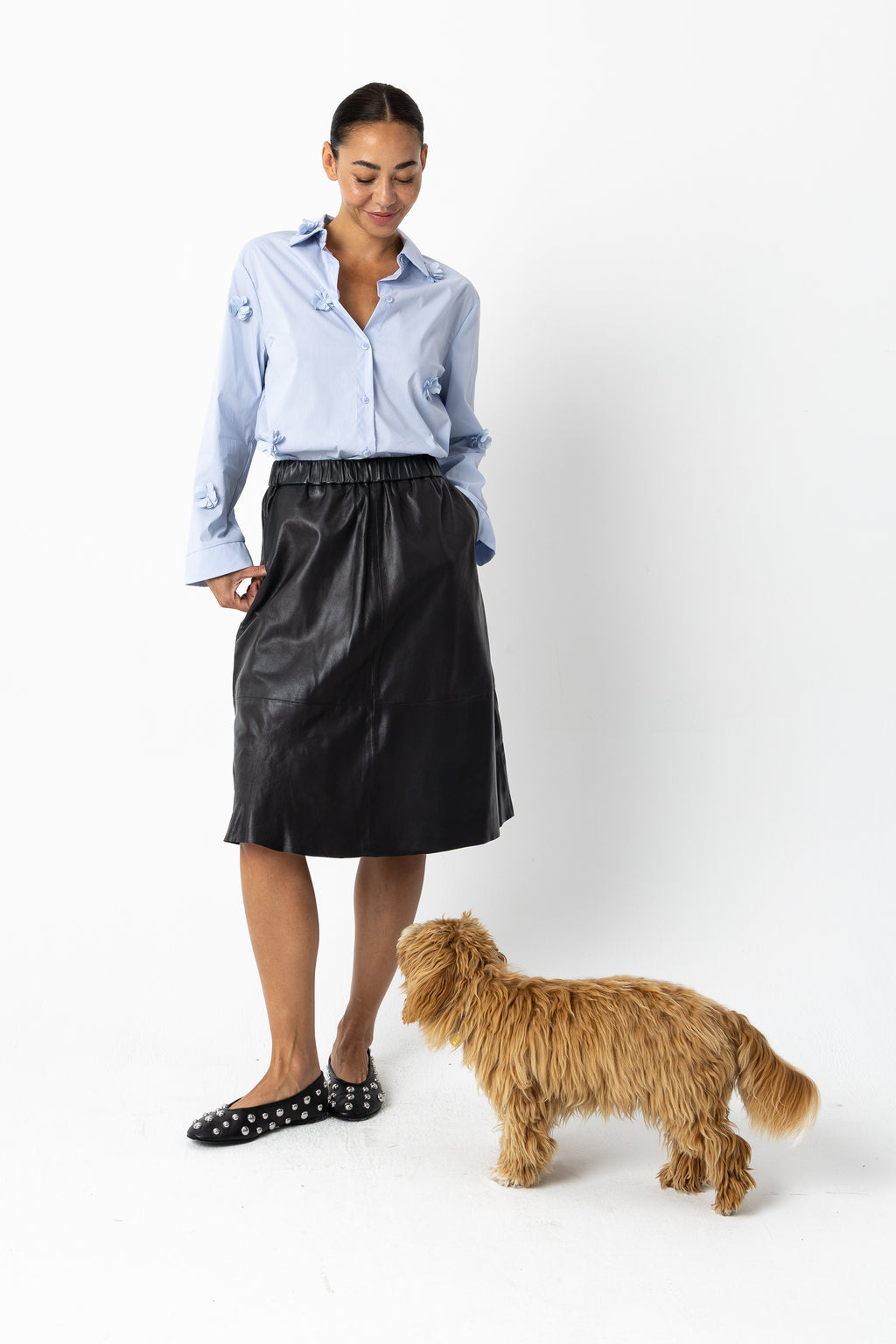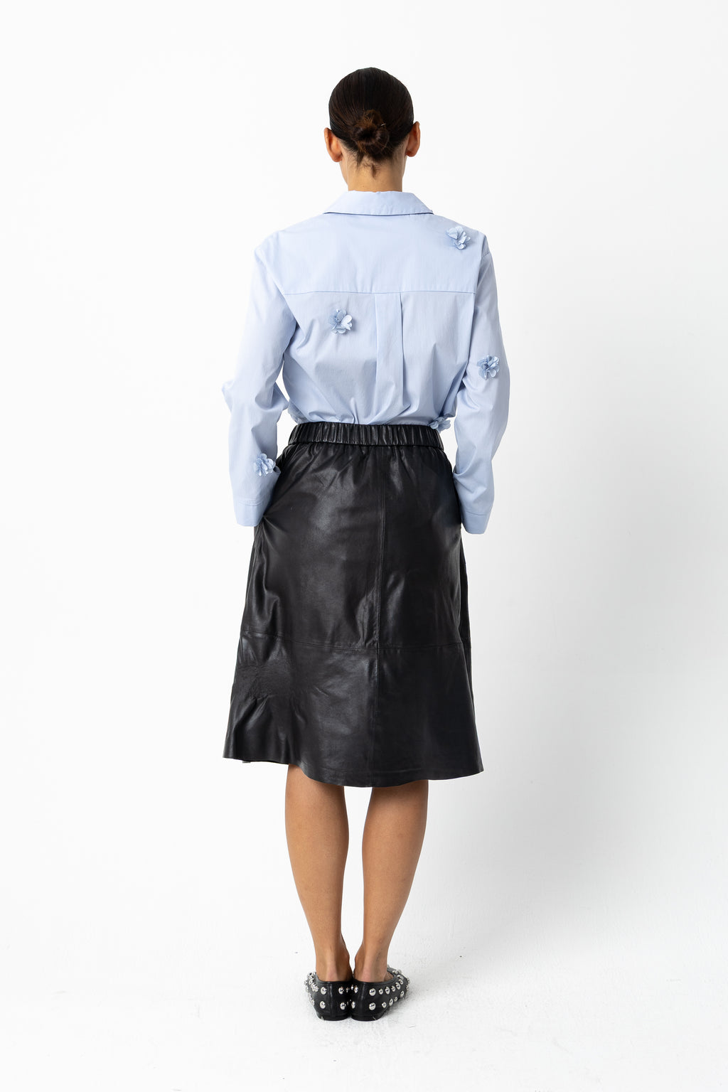 Het model is 173 cm lang en draagt maat S. Ze heeft een borstomtrek van 84 cm, tailleomtrek van 65 cm en heupomtrek van 96 cm.