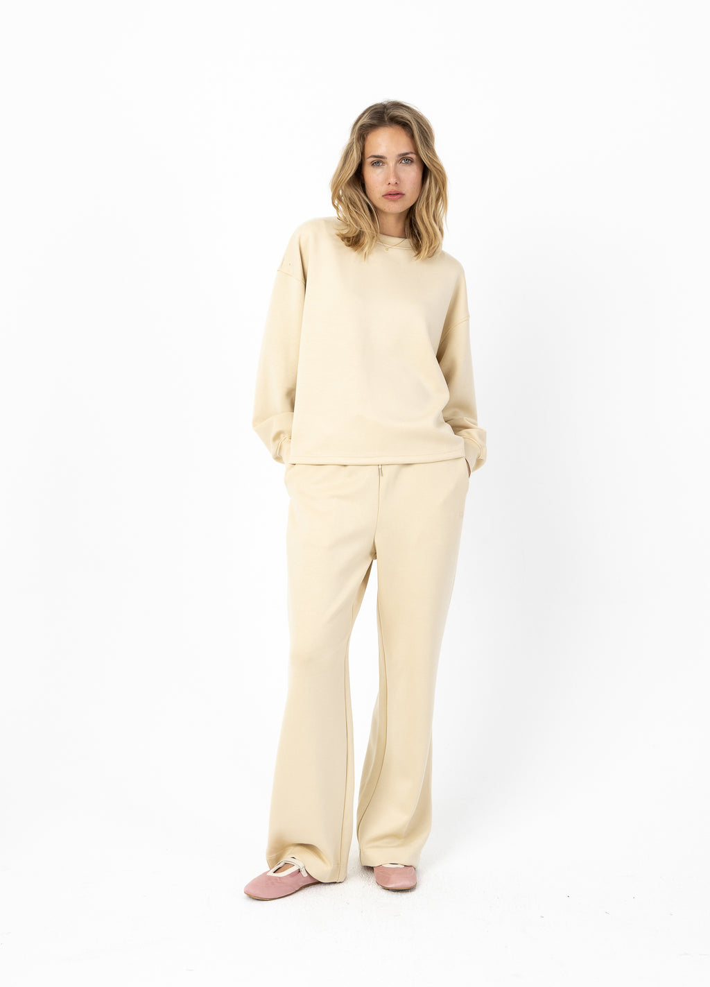 Het model is 173 cm lang en draagt maat S. Ze meet 84 cm rond de borst, 65 cm rond de taille en 96 cm rond de heupen.