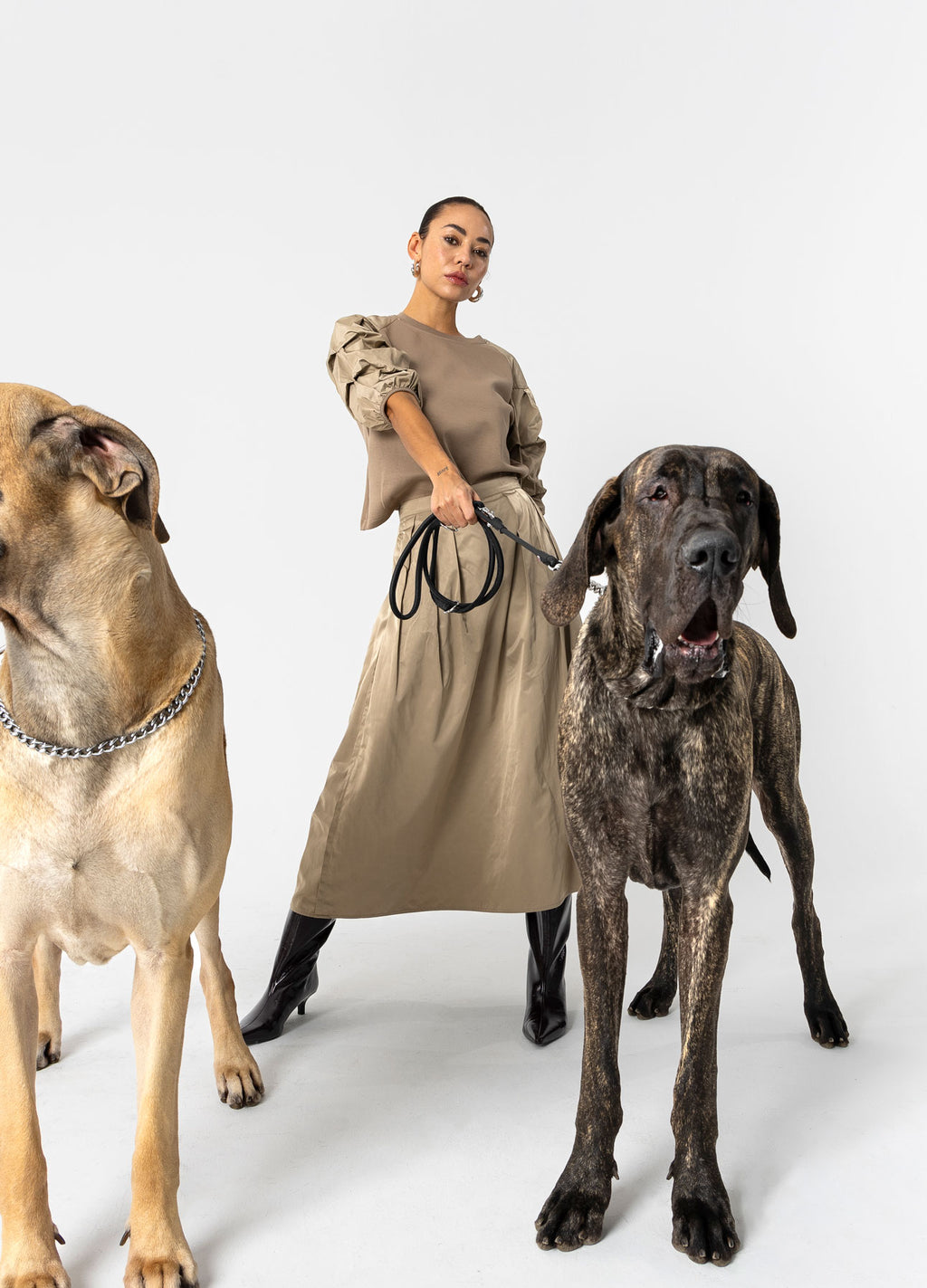 Het model is 173 cm lang en draagt maat S. Ze heeft een borstomvang van 84 cm, een tailleomvang van 65 cm en een heupomvang van 96 cm.