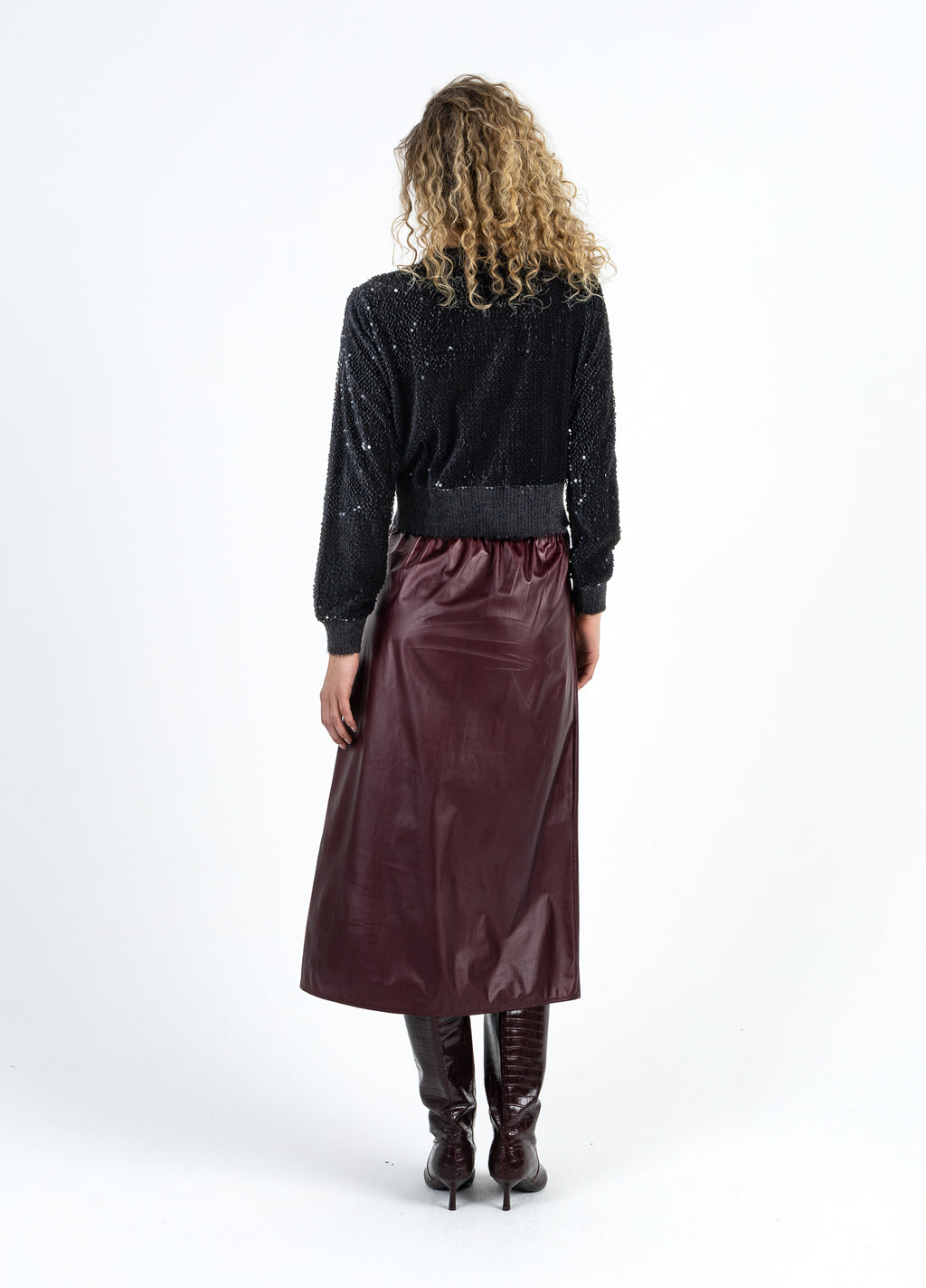Het model is 182 cm lang en draagt maat S. Haar buste meet 82 cm, taille 61 cm en heupen 93 cm.